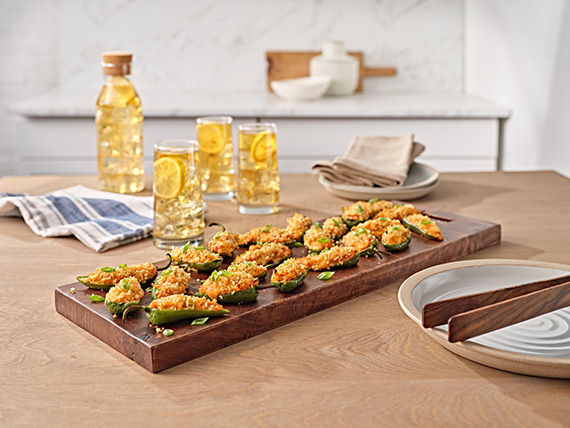 Preheat oven to 400°F. Line a sheet pan with parchment paper. Slice the jalapeños in half lengthwise and use a spoon to scoop out the seeds and membrane. Place sliced jalapeños on prepared sheet pan, cut side up. In a large mixing bowl, stir together the cream cheese, half (3 ounces) of the shredded cheddar, and the barbecue sauce. Stir in green onions and chicken and mix until well combined. In a small bowl, drizzle panko with 1 teaspoon olive oil and stir to moisten crumbs. Fill each pepper generously with the cheese and chicken mixture. Sprinkle remaining 3 ounces of shredded Cheddar evenly over stuffed peppers and top with panko crumbs. Bake the stuffed jalapeños at 400°F for 15 minutes or until the crumb topping is golden and the cheese begins to brown. Serve immediately.